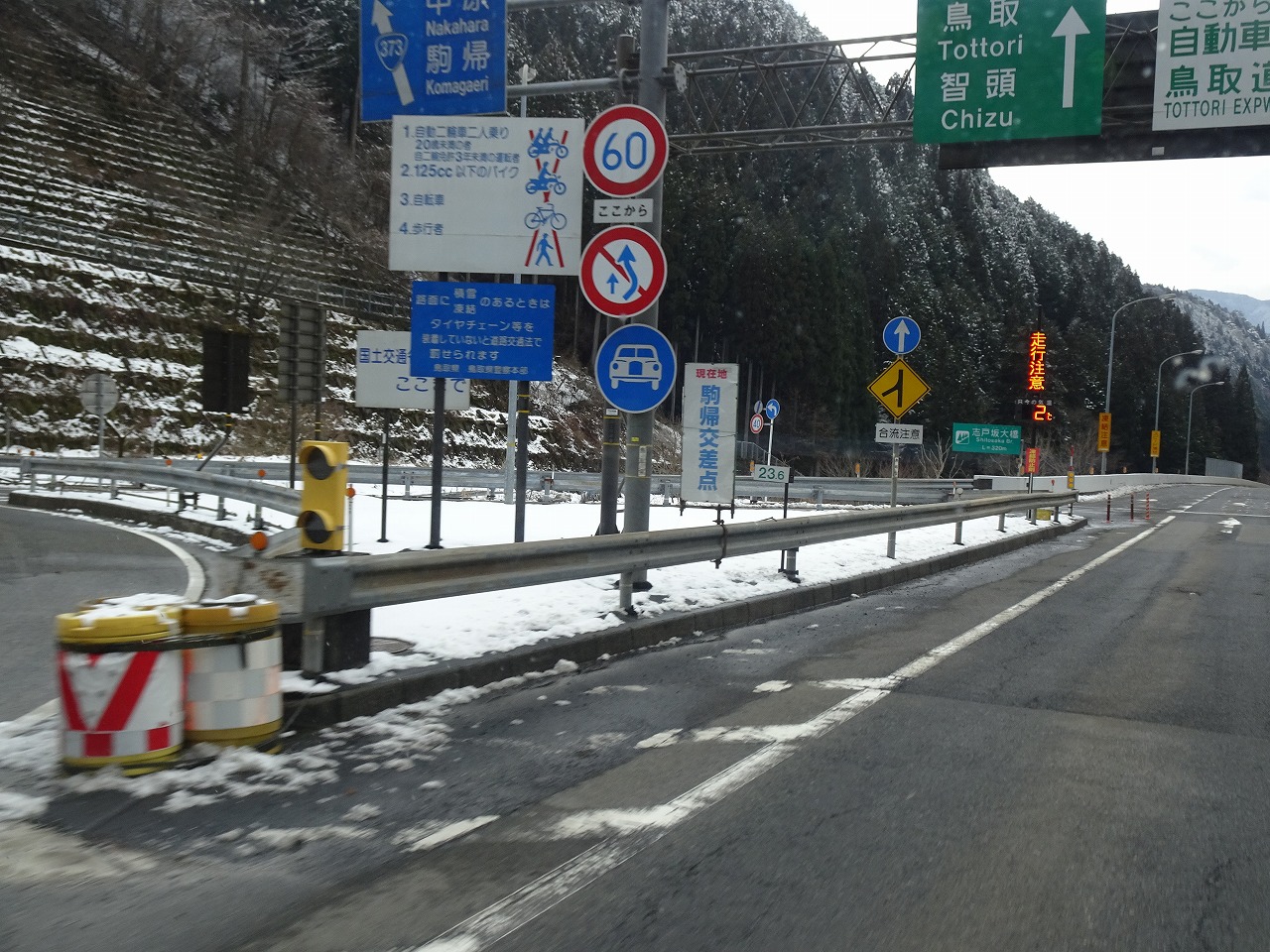 米子道はタイヤ規制!鳥取の方へ来たらまげな強風!峠はやっぱり雪が降っとるがね〜!