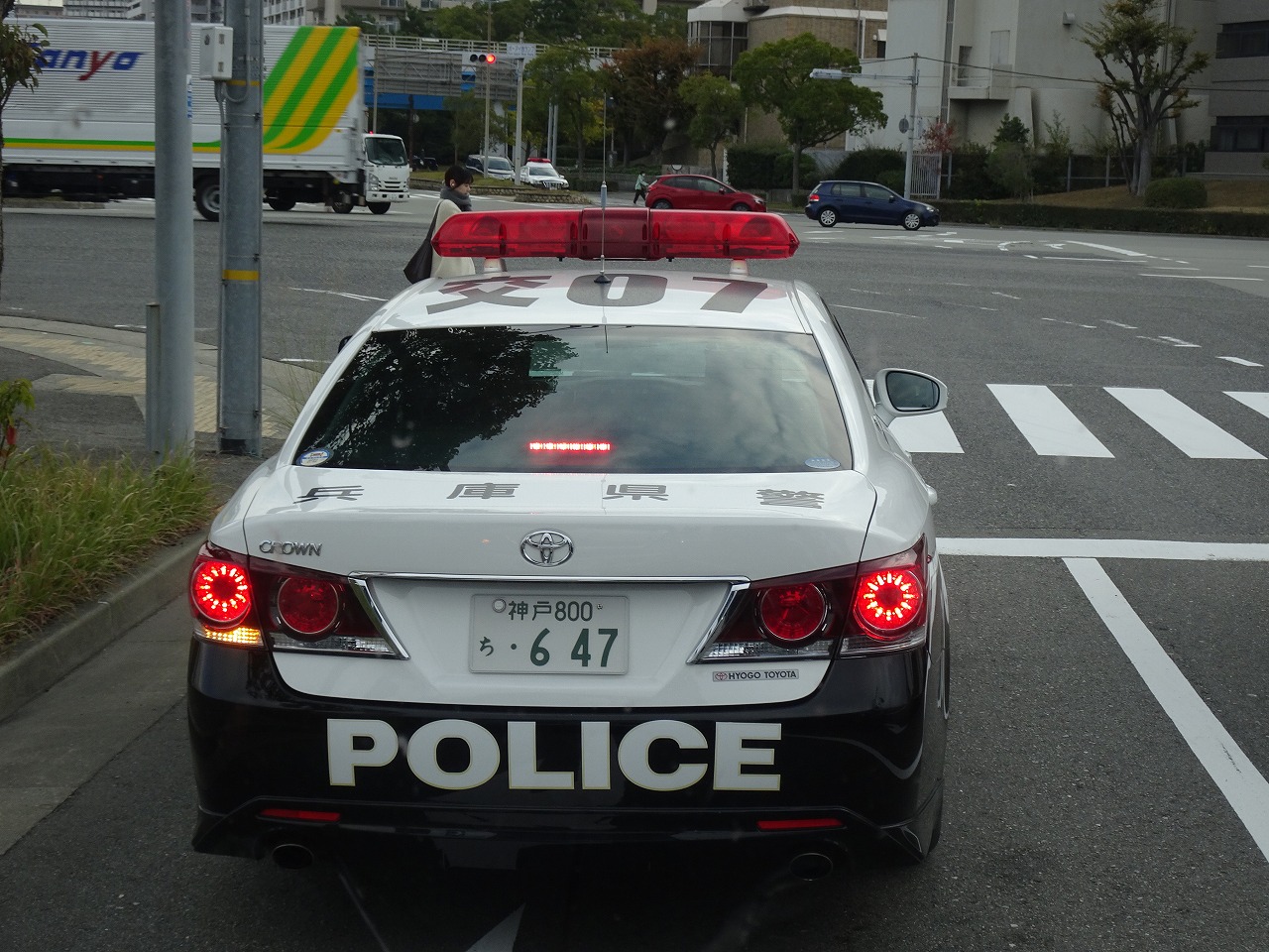 次は大阪へ!信号待ちで兵庫県警のパトカー!朝からご苦労さん!