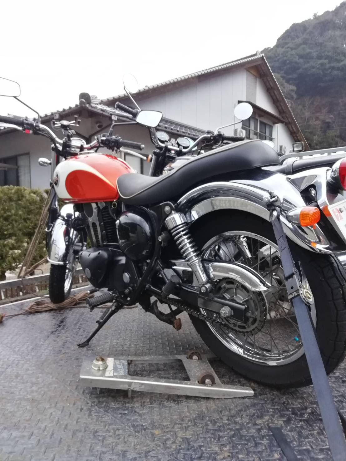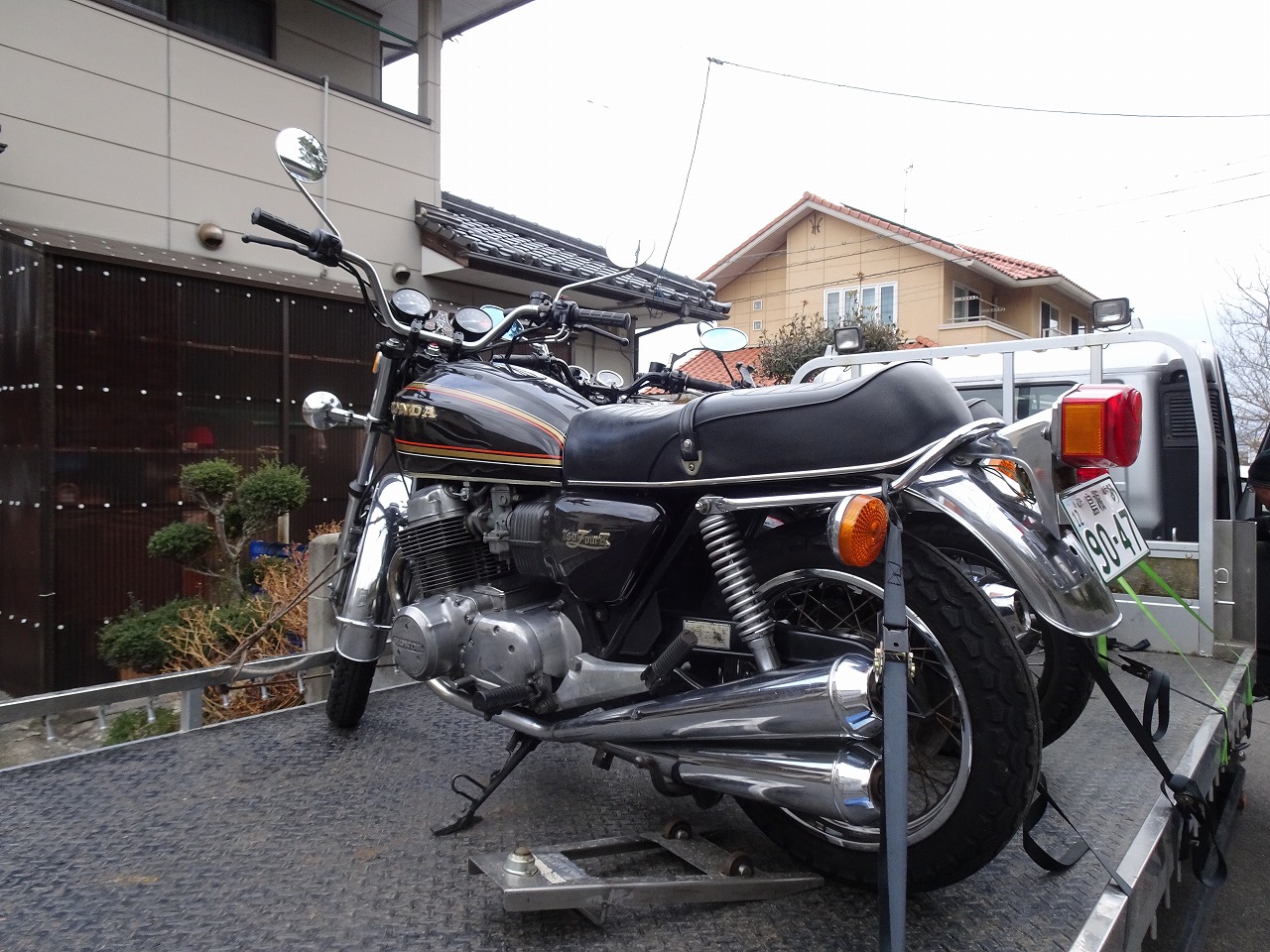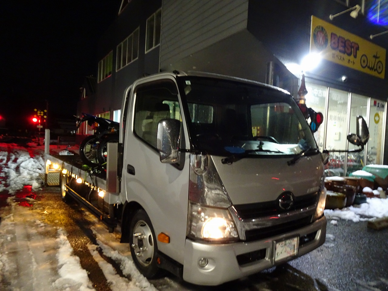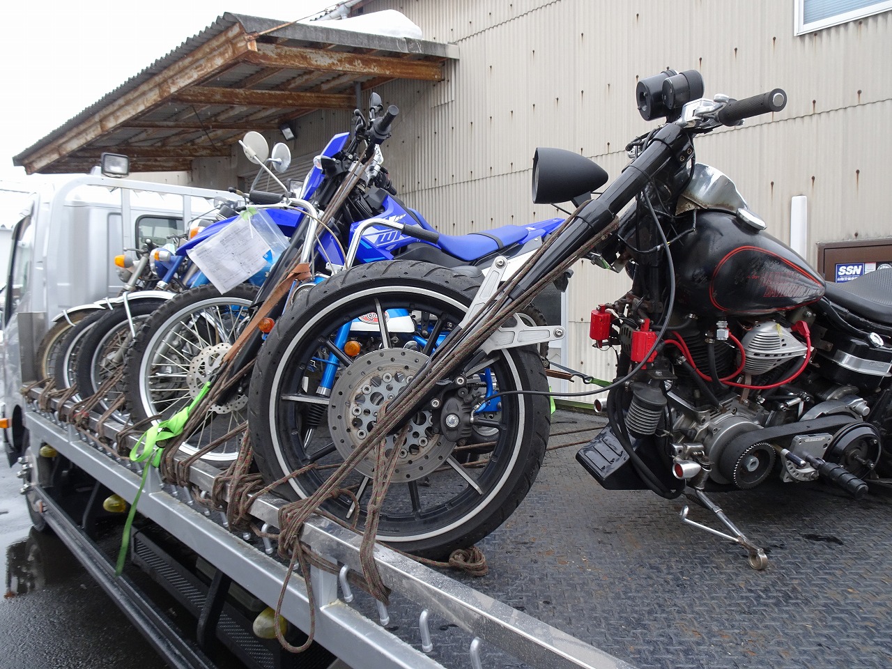 鳥取の知り合いのバイク屋で積み替えて帰ります!結局晩になったがね〜!